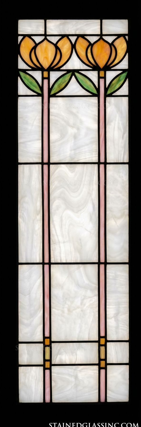 The Prairie Tulip Vertical Panel is a breathtaking example of Arts and Crafts design philosophy translated into decorative glass art. Three golden amber tulip blooms rise on graceful pink stems from the base of this elegant vertical panel, their stylized petals and green leaves rendered with the clean geometric precision and organic naturalism that defined the Prairie School and Arts and Crafts movements of the early twentieth century. The simplified, bold forms of the tulips stand out beautifully against the expansive opalescent white background, which diffuses light with a soft, luminous quality reminiscent of the finest Tiffany art glass.