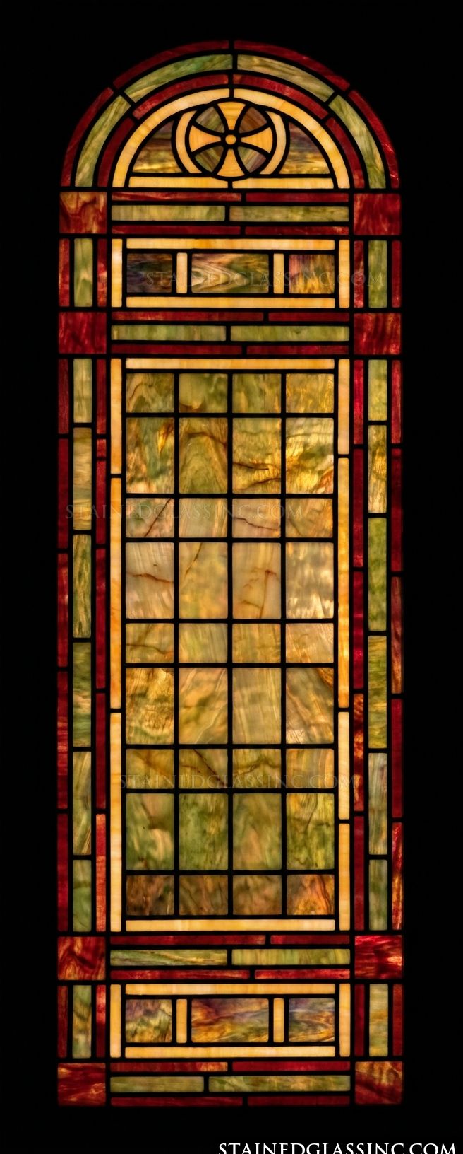 Transform any room with this stunning arched geometric window panel, showcasing the timeless beauty of traditional leaded glass design in a convenient, easy-to-install format. Rich amber and golden tones flow across a bold grid pattern, framed by deep burgundy borders and anchored by a graceful quatrefoil rosette at the crown of the arch.