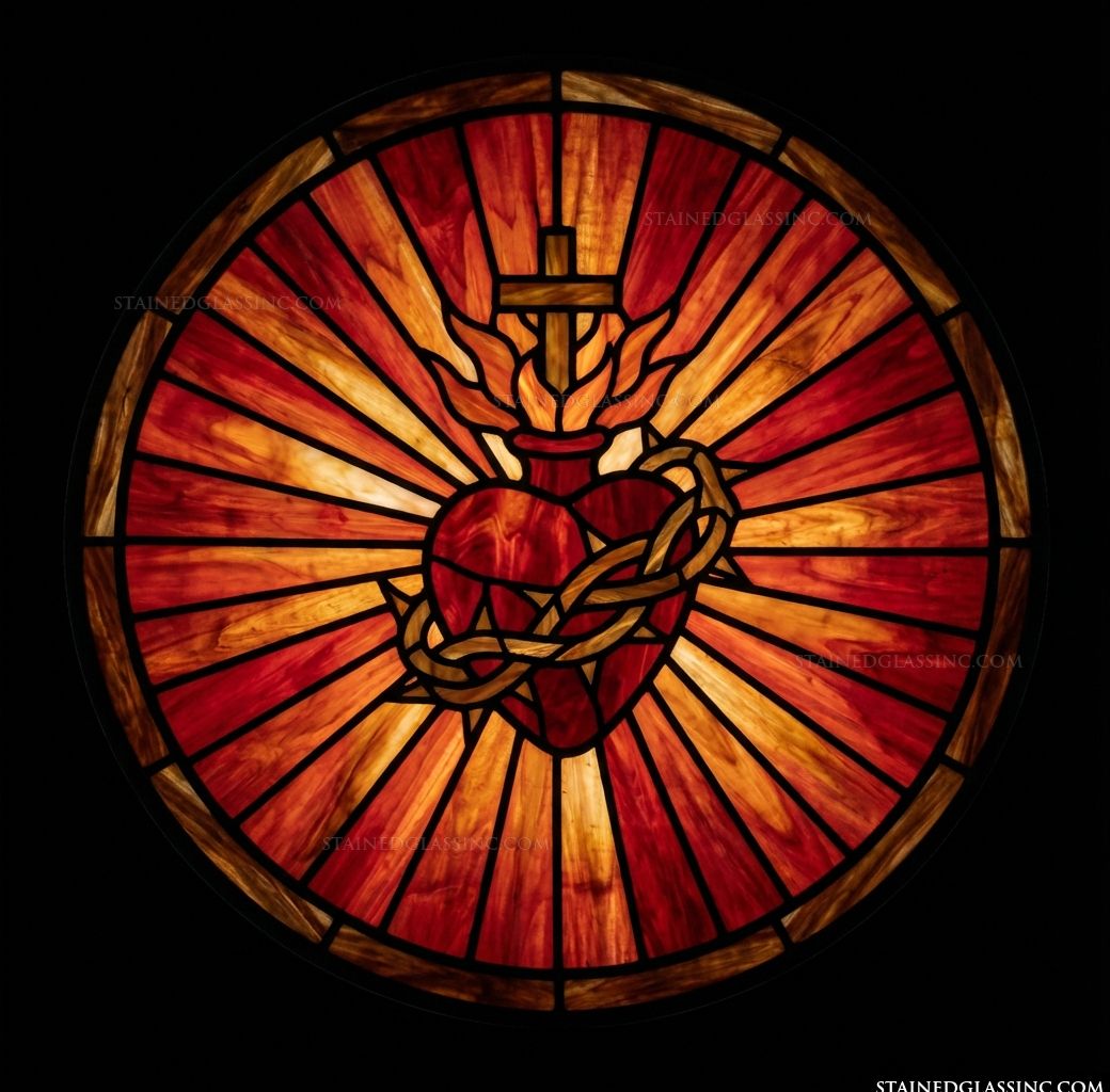Bring the profound beauty of faith into your home or place of worship with the Radiant Heart Window Medallion. This breathtaking piece masterfully captures the deep devotion of the Sacred Heart, featuring the iconic imagery of the central ruby heart intertwined with a rugged crown of thorns, topped with eternal flames and a steadfast cross. The brilliant, alternating rays of amber, crimson, and gold create a mesmerizing sunburst effect, ensuring that the artwork practically glows when touched by the light of day.