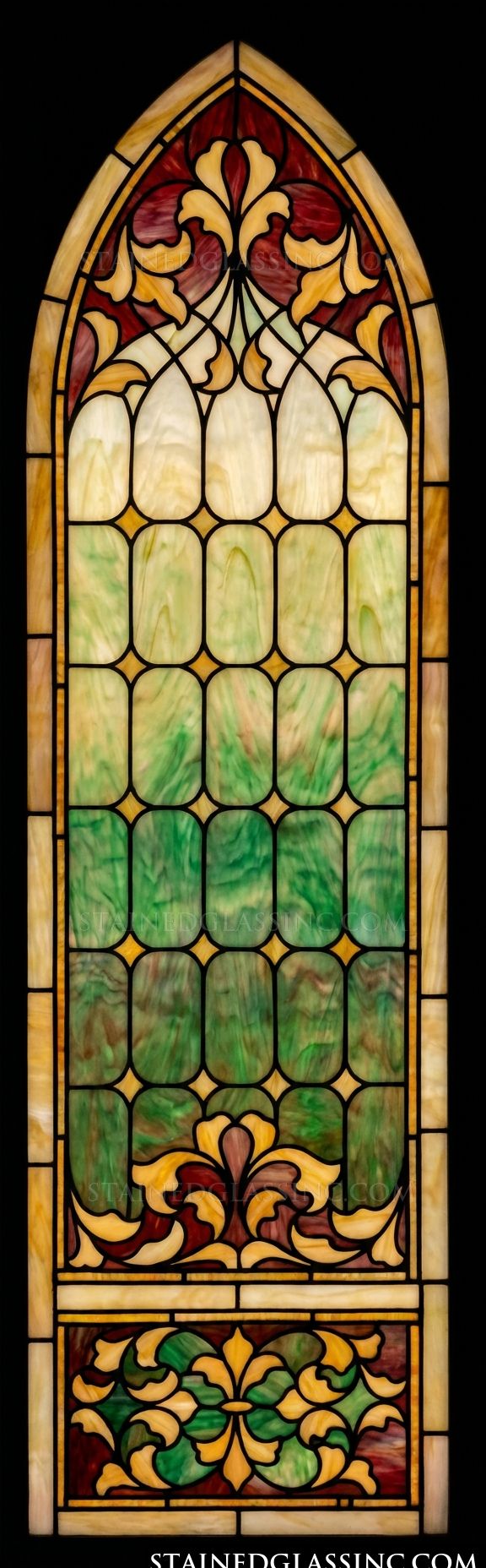 Transform your space with the Emerald Gradient Gothic Arch Window Panel, a breathtaking fusion of traditional architectural design and rich, captivating color. This elegant pointed arch features striking Victorian-inspired scrollwork and classic fleur-de-lis motifs in deep burgundy and warm gold at both the crown and the beautifully detailed base. The true centerpiece is the stunning grid of mottled panes that seamlessly transition in a soothing color gradient, cascading from a creamy, translucent white at the peak down to a deeply saturated emerald green.