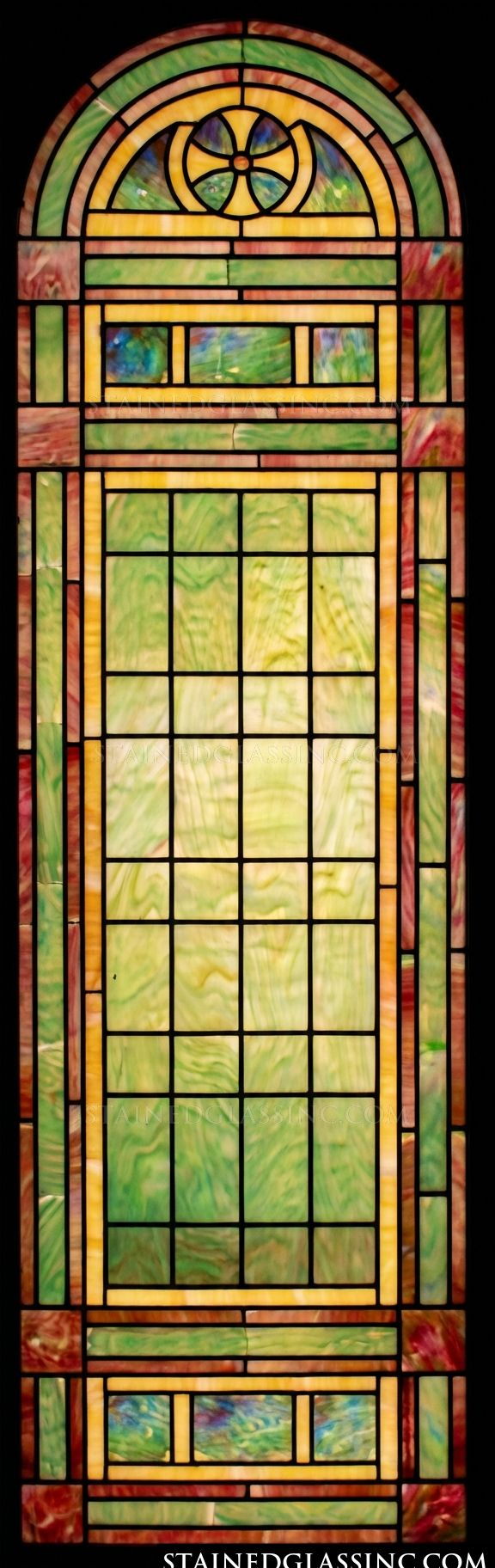 Transform your space with the Celtic Arch Geometric Window Panel, a harmonious blend of Mission-style simplicity and traditional architectural elegance. This beautiful arched piece features a structured geometric grid in calming shades of mottled green and warm amber, framed by rich burgundy accents. The crowning detail is a classic Celtic-inspired cross nestled within the top arch, creating a serene focal point that pays homage to historical sanctuary and craftsman designs.