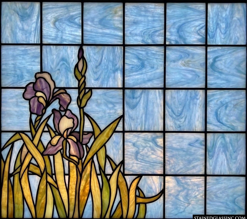 Refresh your home with the calming presence of the Tranquil Iris Grid Window Panel. This beautiful square piece perfectly balances organic nature with structured geometric design, featuring delicate purple irises and sweeping green and amber leaves blooming from the lower corner. The vibrant floral arrangement is set against a serene, structured grid of luminous light blue panes, capturing the peaceful essence of a spring garden against a clear morning sky. The structured panes give a subtle nod to classic Arts and Crafts or Prairie style design, making it a versatile addition to both traditional and contemporary interiors.