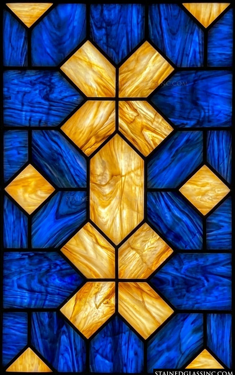 Whether you are looking to enhance a sunny hallway window, add a splash of vibrant color to a modern living area, or give a striking gift to a lover of abstract design, this panel is crafted to inspire. The crisp blues and warm ambers beautifully capture and filter the sunlight, casting a vivid, dynamic glow that breathes life into your decor. Experience the enduring beauty and bold elegance of this magnificent architectural accent.