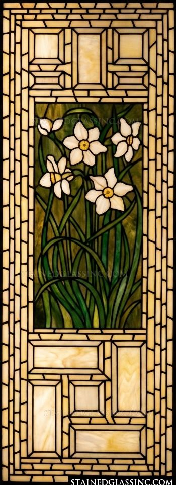 Refresh your home with the natural beauty and architectural elegance of the Prairie Garden Daffodil Window Panel. This striking rectangular piece perfectly balances organic floral motifs with structured Prairie-style design, featuring a lively cluster of white daffodils and tall green leaves reaching upwards. The vibrant central garden scene is beautifully framed by an intricate, brick-like border of warm amber and cream panes. This complex geometric lattice gives a distinct nod to the classic Arts and Crafts movement, making it a brilliant, versatile addition to both traditional craftsman homes and contemporary interiors.