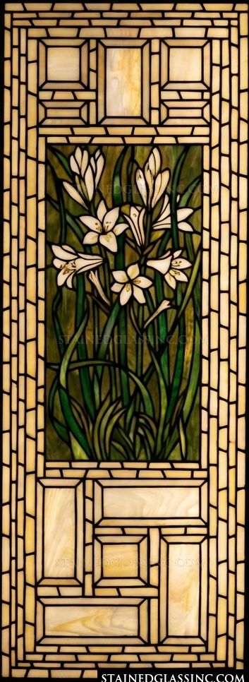 Refresh your home with the natural beauty and architectural elegance of the Prairie Lily Garden Window Panel. This striking rectangular piece perfectly balances organic floral motifs with structured Prairie-style design, featuring a lively cluster of delicate white lilies and tall, sweeping green leaves reaching upwards. The vibrant central garden scene is beautifully framed by an intricate, brick-like border of warm amber and cream panes. This complex geometric lattice gives a distinct nod to the classic Arts and Crafts movement, making it a brilliant, versatile addition to both traditional craftsman homes and contemporary interiors.