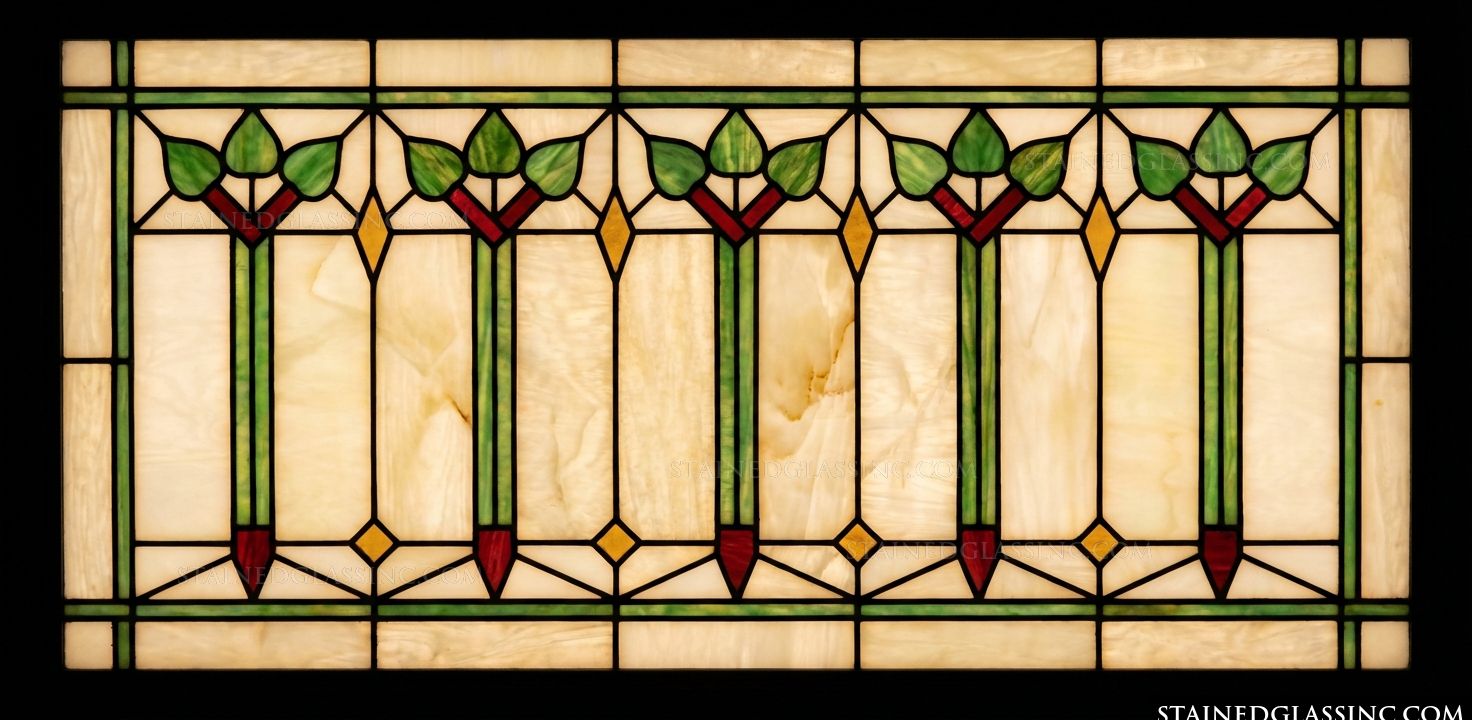 Refresh your home with the classic architectural beauty of the Trianon Lattice Transom Window Panel. This elegant horizontal piece perfectly captures the structured elegance of Prairie-style design, featuring a harmonious repeating motif of stylized green leaves and striking red accents resting atop tall, linear stems. The vibrant botanical elements stand out beautifully against a background of warm, mottled amber and cream panes, accented by delicate yellow diamond details. This structured, linear lattice gives a distinct nod to the classic Arts and Crafts movement, making it a brilliant, versatile addition above doorways, in entryways, or along wide contemporary windows.