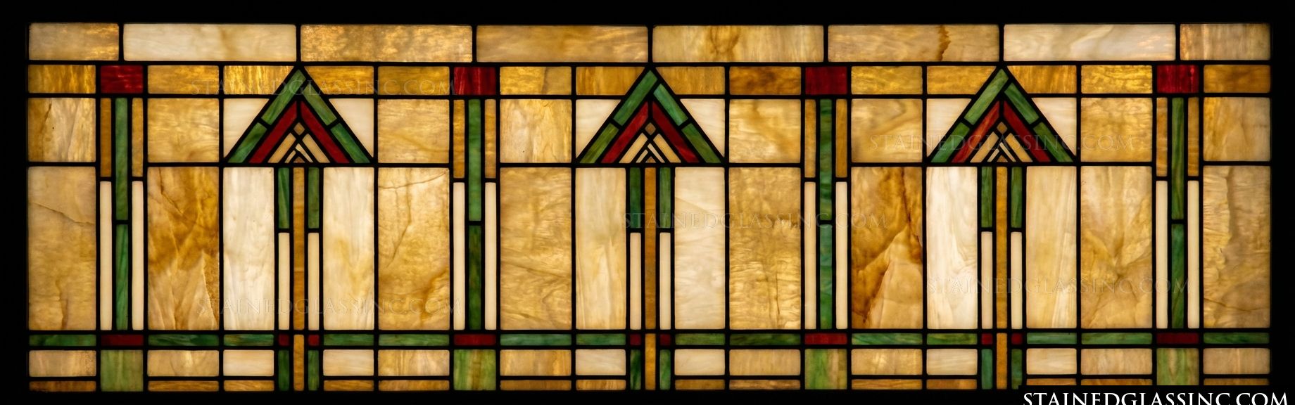 Refresh your home with the structured architectural beauty of the Arrowhead Transom Window Panel. This striking horizontal piece perfectly captures the essence of classic Prairie-style and Mission design, featuring a harmonious repeating motif of upward-pointing arrowheads or stylized geometric trees. The bold architectural elements, beautifully rendered in rich forest green and deep red, stand out brilliantly against a serene background of warm, mottled amber and cream panes. This linear, perfectly balanced lattice makes it a versatile and captivating addition above doorways, wide accent windows, or within cozy craftsman living spaces.