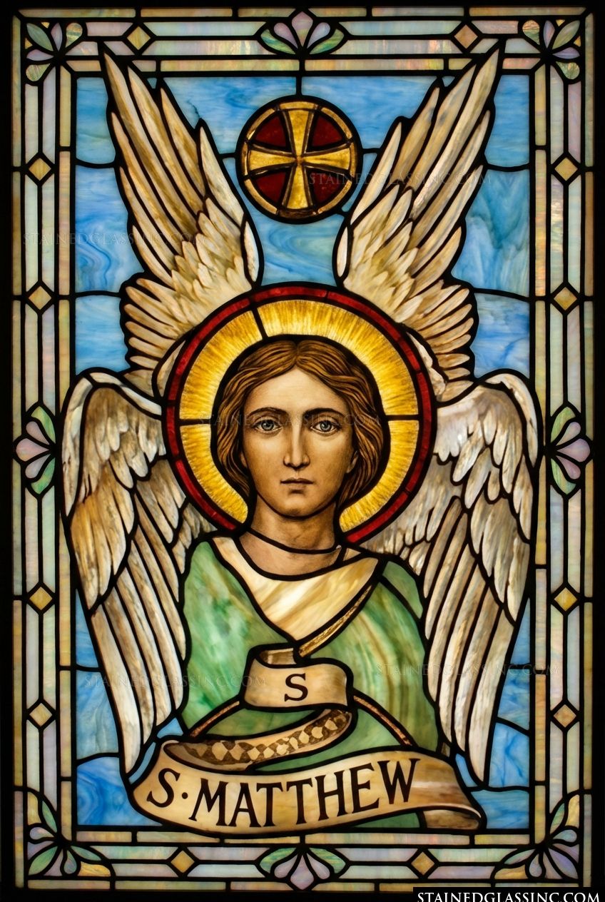 Bring the profound beauty and reverence of classic religious iconography into your home or chapel with the St. Matthew the Evangelist Window Panel. This breathtaking vertical piece masterfully portrays Saint Matthew, traditionally symbolized in Christian art as a divine winged man or angel, representing the human lineage of Christ detailed in his Gospel. The saint is beautifully depicted with a radiant golden halo, majestic feathered wings, and a flowing green robe, holding a graceful banner bearing his name. A striking golden cross emblem rests above him, all set against a tranquil, mottled blue sky and framed by an elegant, traditional geometric border.