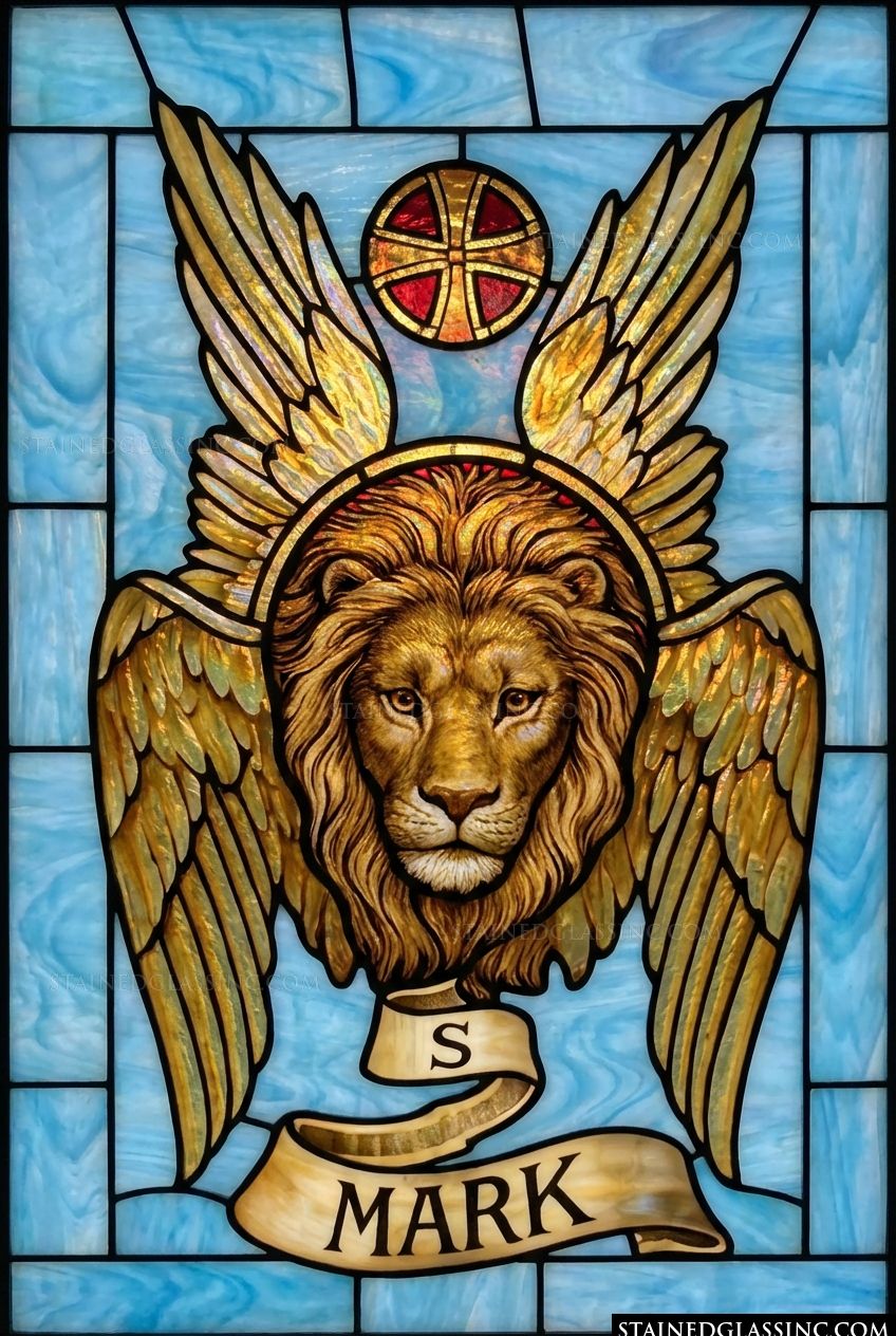 Bring the profound beauty and reverence of classic religious iconography into your home or chapel with the St. Mark the Evangelist Window Panel. This breathtaking vertical piece masterfully portrays Saint Mark, traditionally symbolized in Christian art as a majestic winged lion, representing the royal dignity of Christ and the resurrection detailed in his Gospel. The magnificent lion is beautifully depicted with a regal golden mane, sweeping feathered wings, and a radiant halo, hovering above a graceful scroll bearing his name. A striking golden and ruby red cross emblem rests prominently above him, all set against a tranquil, mottled light blue sky.