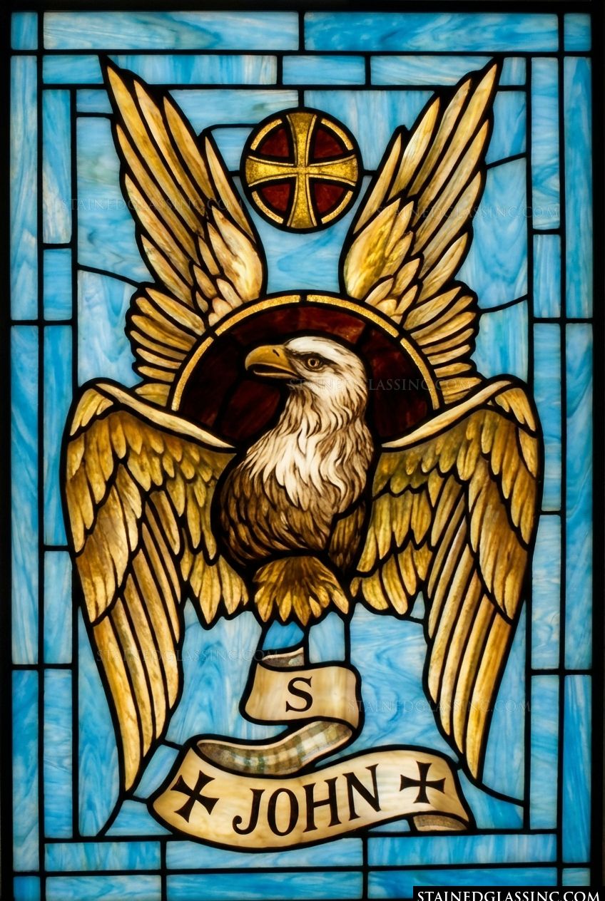 Bring the profound beauty and reverence of classic religious iconography into your home or chapel with the St. John the Evangelist Window Panel. This breathtaking vertical piece masterfully portrays Saint John, traditionally symbolized in Christian art as a majestic soaring eagle, representing the divine heights and spiritual depth detailed in his Gospel. The magnificent eagle is beautifully depicted with sweeping golden wings and a radiant dark halo, perched gracefully above a scroll bearing his name. A striking golden and ruby red cross emblem rests prominently above him, all set against a tranquil, mottled light blue sky.