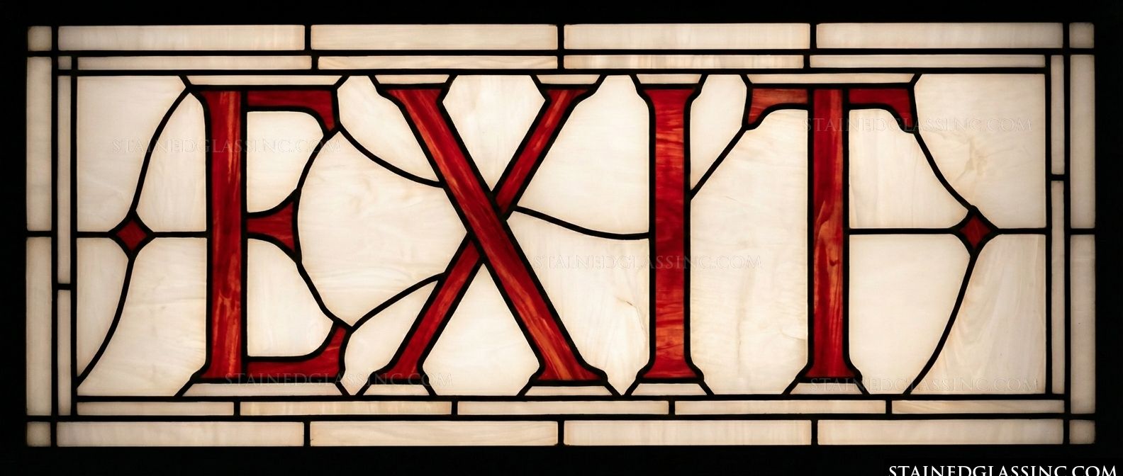 Guide your guests with clarity and style using the Crimson Exit Typography Transom Panel. This beautifully crafted horizontal piece seamlessly blends functional directional signage with classic architectural elegance, featuring the word "EXIT" boldly spelled out in striking, ruby red serif lettering. The elegant typography stands out brilliantly against a serene background of warm, mottled cream and light amber panes. This perfectly balanced, traditional lattice design makes it an ideal, clear addition above doorways in both sophisticated commercial spaces and large, elegant residential settings.