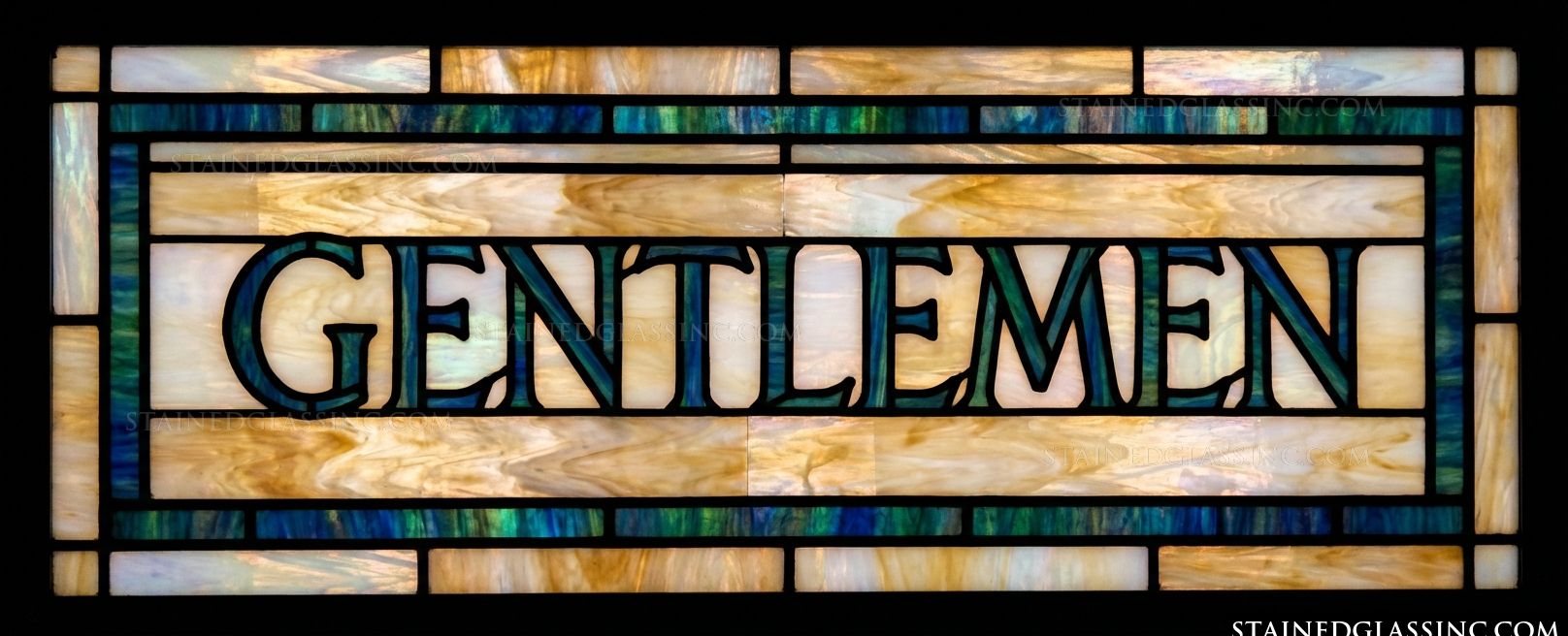 Guide your patrons with clarity and sophisticated style using the Teal Gentlemen Typography Transom Panel. This beautifully crafted horizontal piece seamlessly blends functional directional signage with classic architectural elegance, featuring the word "GENTLEMEN" boldly spelled out in striking, deep teal and green serif lettering. The elegant typography stands out brilliantly against a serene background of warm, mottled cream and light amber panes, beautifully framed by a matching teal border. This perfectly balanced, traditional lattice design makes it an ideal, clear addition above washroom doorways in sophisticated commercial spaces, restaurants, or historic venues.