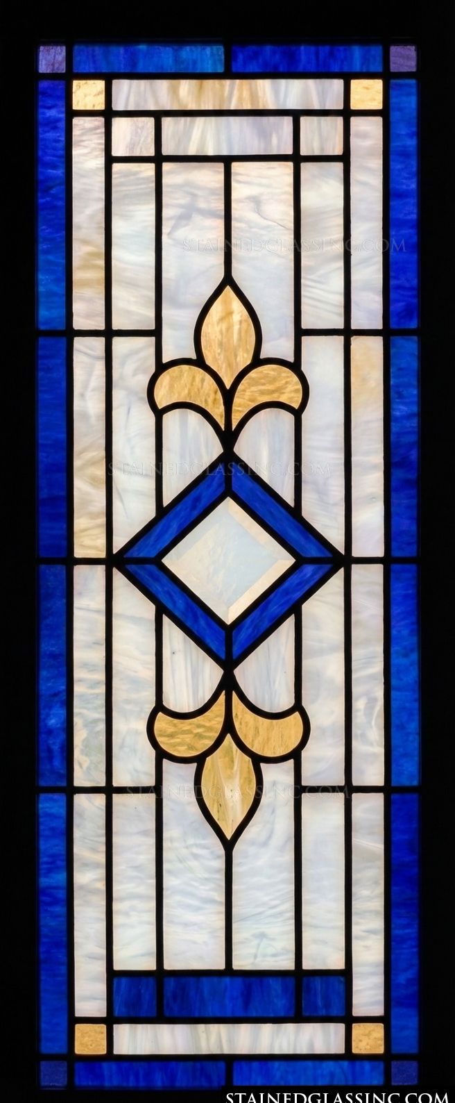 This sophisticated design captures the timeless elegance of the fleur-de-lis. Centered within a striking diamond motif, the gilded, stylized lily creates a graceful focal point that draws the eye upward. The classic combination of rich, deep cobalt blue and warm, opalescent cream provides a beautiful contrast, giving the piece a sense of calm, balanced refinement.