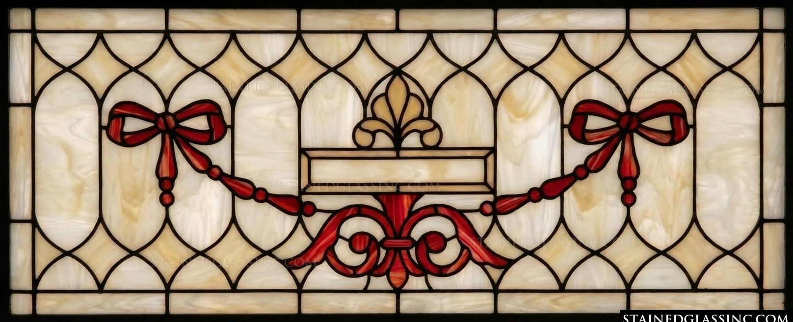 The luminous, cream-colored lattice backdrop provides a soft, glowing canvas that allows the rich red tones of the ribbons and ornate accents to truly pop. This piece brings a touch of refined grace to any space, offering a harmonious balance between structured geometric precision and free-flowing decorative beauty.