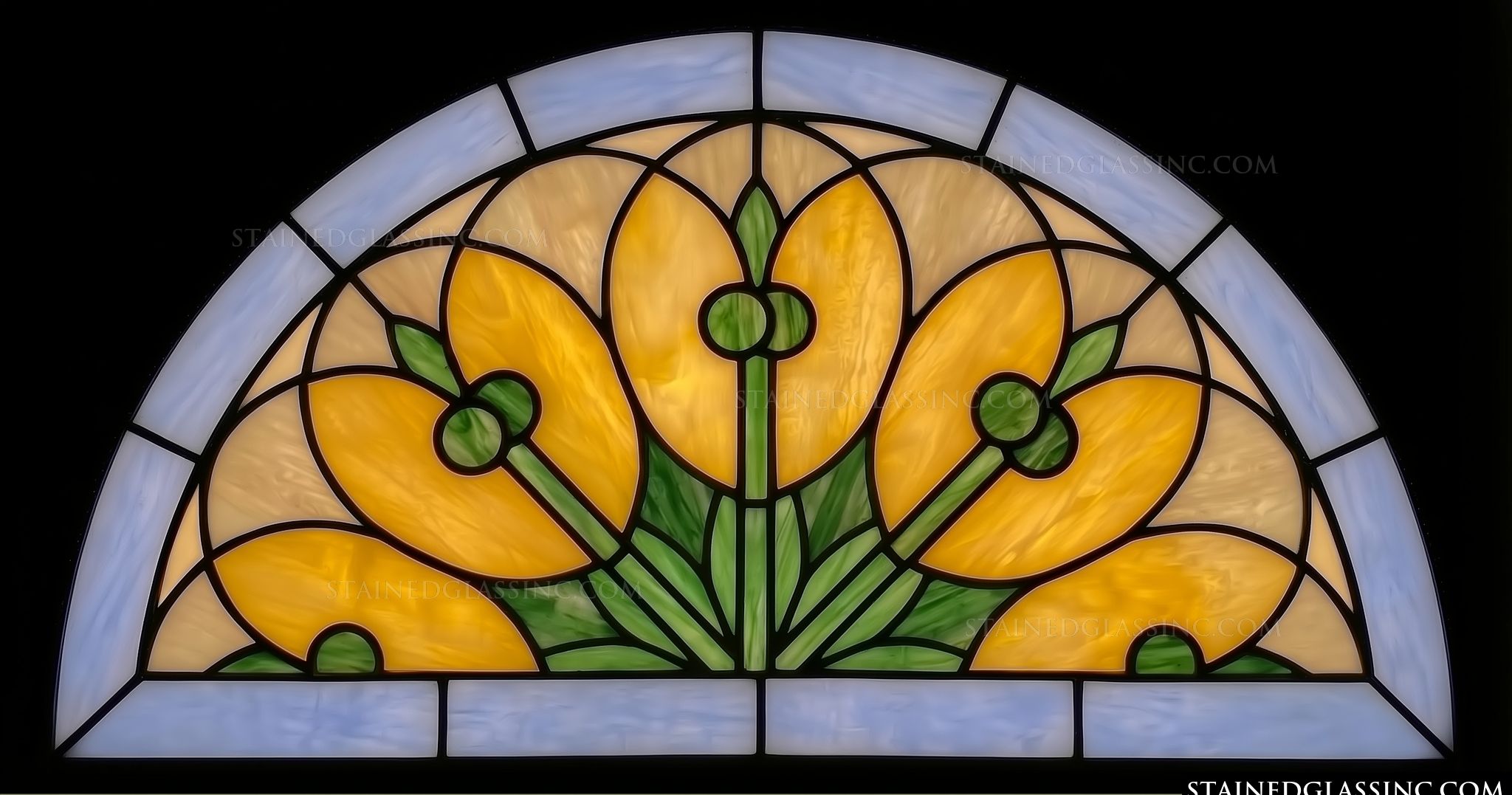 Embrace the warmth of golden light with this stunning, semi-circular artistic design. Inspired by the grace of Art Nouveau, the composition features bold, stylized petals in vibrant honey-gold hues, anchored by deep green foliage that radiates outward from the center.