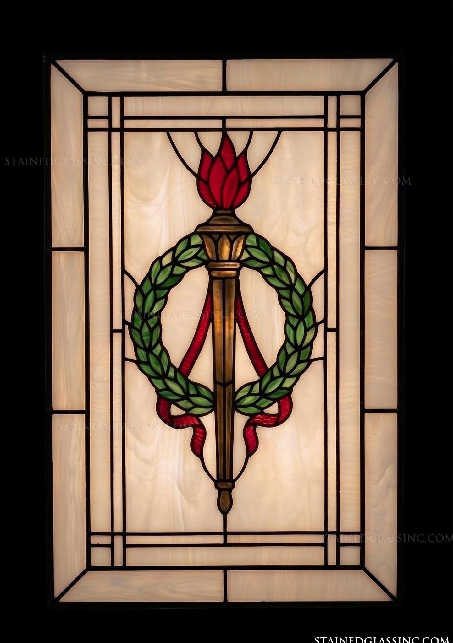This classic, refined composition captures the essence of achievement and light. A central, vertical torch burns with a steady crimson flame, representing inspiration and knowledge. The torch is perfectly framed by a vibrant green laurel wreath, a traditional symbol of triumph and celebration.