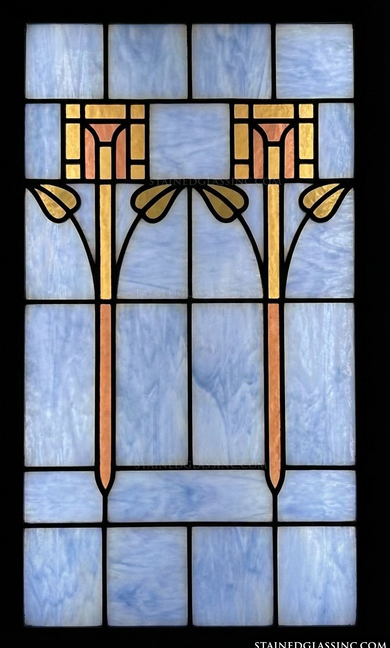 This luminous design draws inspiration from the graceful lines of the Art Nouveau movement. Two elegant, stylized floral stalks rise in perfect symmetry, punctuated by warm, golden geometric blossoms that offer a beautiful contrast against a backdrop of ethereal, sky-blue hues.