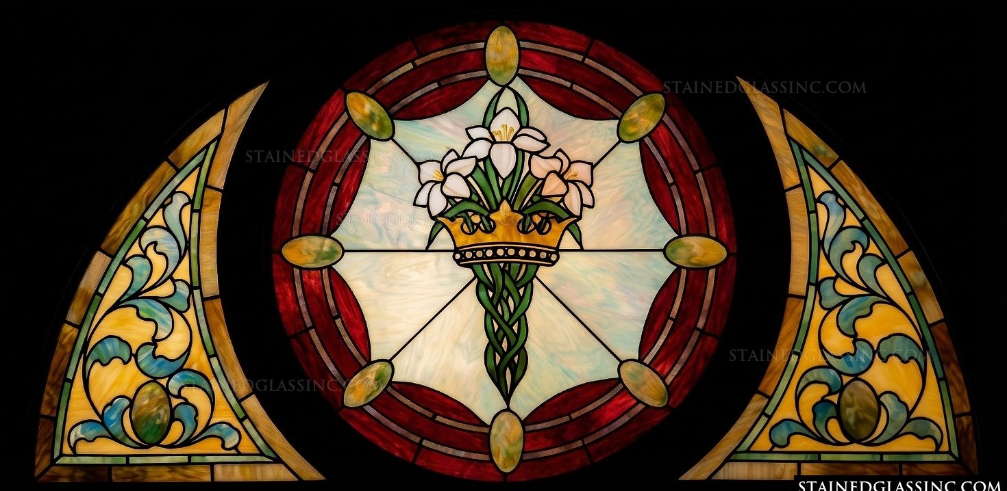 This exquisite design captures a powerful spiritual motif, centering on a brilliant golden crown entwined with pristine white Easter lilies. The lilies, a classic symbol of purity and rebirth, rise gracefully from the crown, which serves as a majestic emblem of victory and royalty. The harmonious composition radiates a sense of peace and hope, making it a perfect focal point for any reflective space.