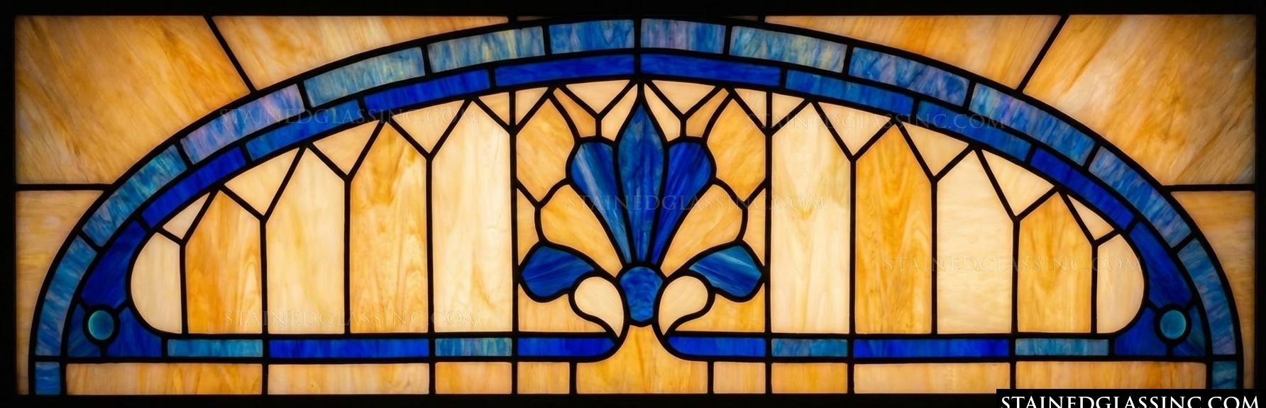 Set against a warm, luminous backdrop of mottled amber, the striking blue centerpiece appears to glow from within. This piece serves as a masterclass in balance and geometric refinement, making it an ideal choice for enhancing a transom or an arched doorway. Its classic composition adds a touch of architectural grandeur and refined artistic flair to your home.