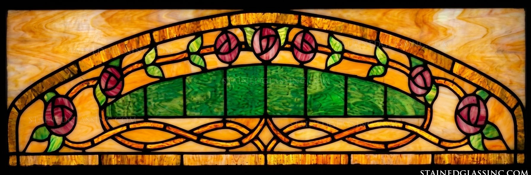 Bathed in a luminous, sun-drenched amber glow, the design is punctuated by the rich, deep tones of the rose petals and vibrant emerald leaves. This piece brings a touch of warmth and botanical grace to any space, offering a timeless aesthetic that celebrates the intricate interplay of color and light.