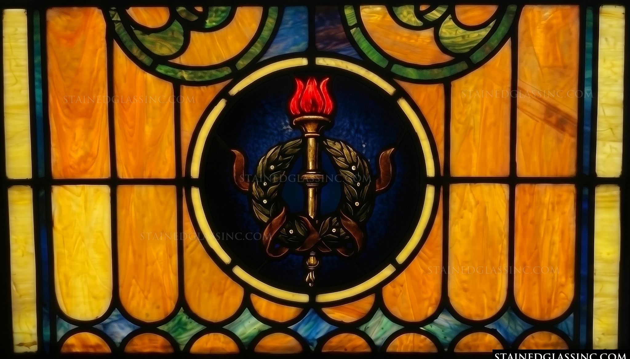 Surrounding the medallion is a rich, warm framework of golden, marbled glass that radiates a sense of warmth and optimism. The fluid, arched lines of the border provide a soft, balanced structure that complements the central emblem perfectly, creating a refined atmosphere suitable for both traditional and contemporary settings.