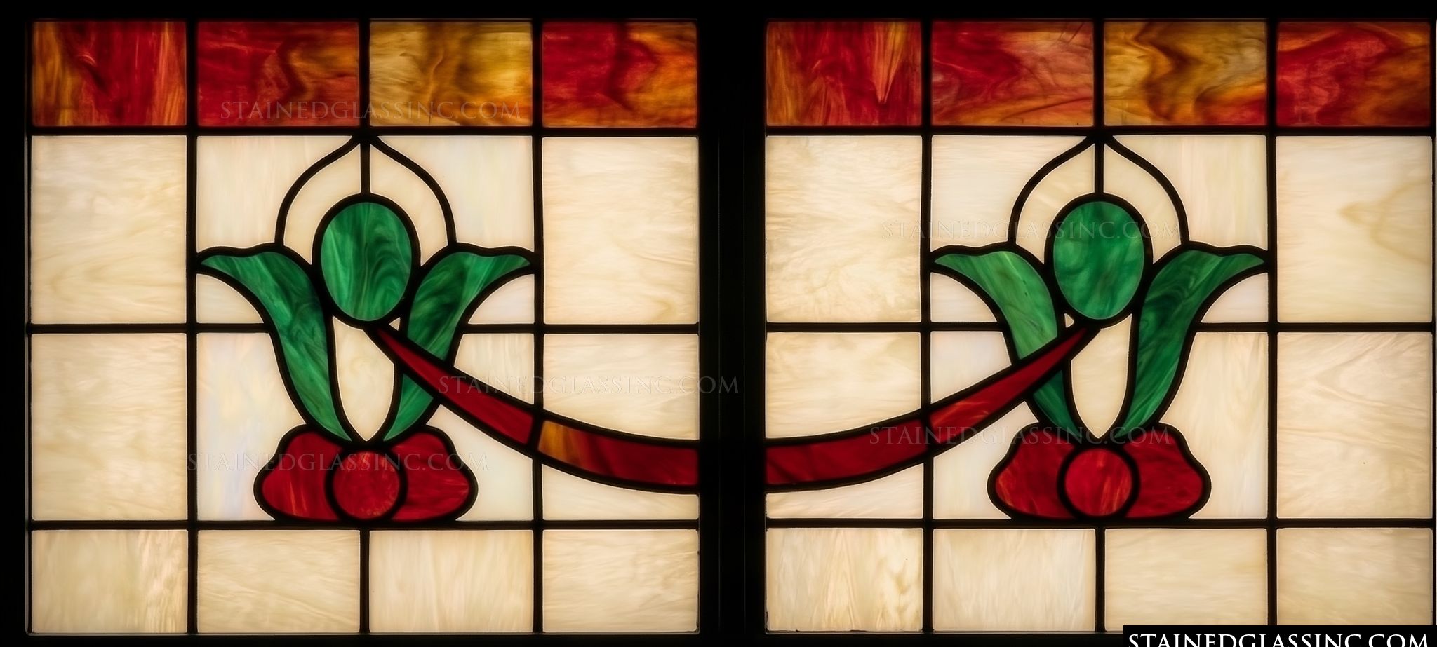 Embrace the timeless elegance of this stained-glass-style artistry, featuring a refined symmetrical botanical motif. Two stylized floral blooms, rendered in deep emerald green and warm crimson, mirror each other across the composition, creating a balanced and harmonious visual flow.