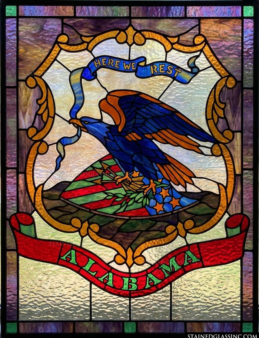 This striking piece brings the historic Alabama state seal to life with brilliant, luminous colors and intricate detail. The noble eagle, rendered in deep blues and warm, glowing tones, stands as the centerpiece, clutching the iconic scroll that declares Here We Rest. The design captures the spirit and pride of the state through its bold, graphic composition and rich, textured appearance.