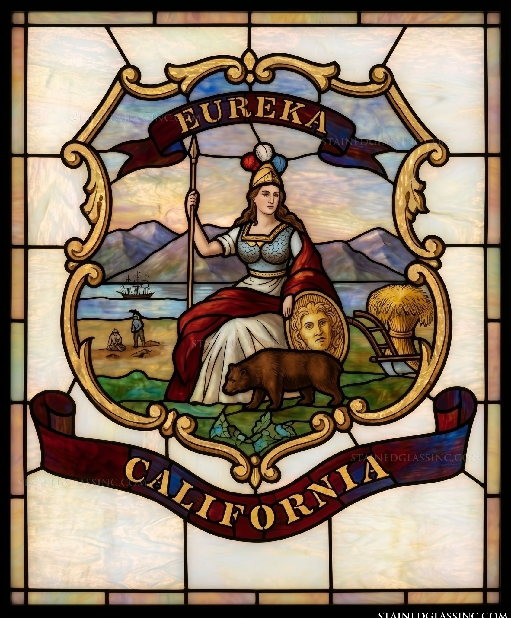 Embrace the rich history and spirit of the Golden State with this beautifully crafted artistic interpretation of the California state seal. The centerpiece features the Roman goddess Minerva, poised with elegance and strength, representing the wisdom of the state's founding. She is surrounded by iconic symbols including the sturdy grizzly bear, a bountiful sheaf of wheat, and the distant silhouette of a ship upon the water.