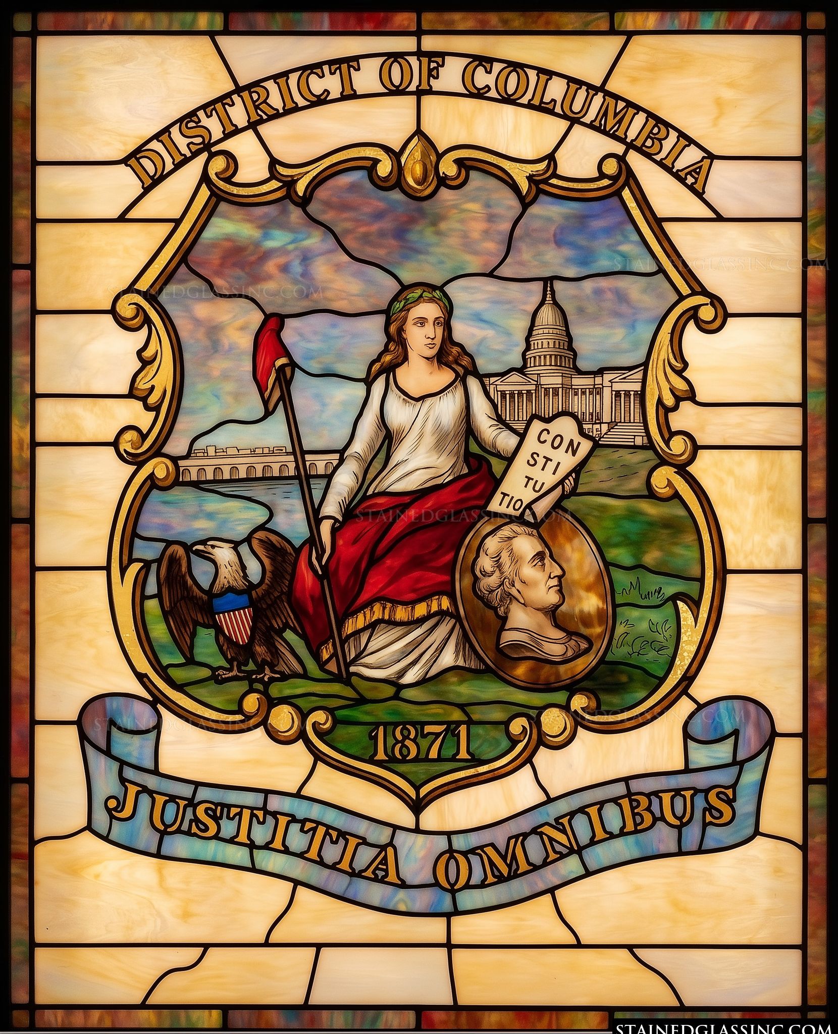 This luminous design brings the official seal of the District of Columbia to life through vibrant artistry. At the center, a majestic female figure representing Justice holds a tablet inscribed with the word Constitution, flanked by the iconic dome of the United States Capitol and a proud American eagle. The scene is framed by intricate golden scrollwork, capturing a sense of civic dignity and historical pride.