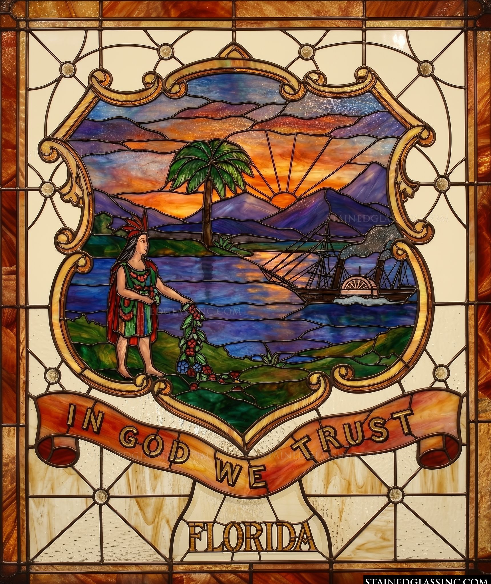 This captivating design reimagines the historic seal of Florida with the radiant depth and artistry of classic stained-glass styling. The central medallion showcases a lush, tropical landscape at twilight, where a vibrant sun dips below purple-hued mountains, casting a brilliant glow over the rippling waters. A traditional paddle-wheel steamboat glides across the horizon, while a native figure stands gracefully in the foreground, scattering blossoms to capture the spirit of discovery and history.