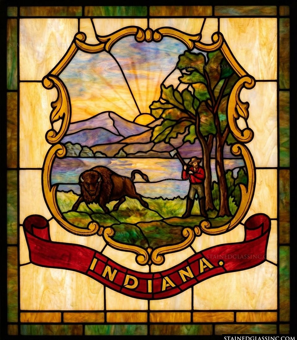 This vibrant artistry brings to life the storied imagery of Indiana’s state seal. A pioneer woodsman stands amidst a lush landscape, axe in hand, as a buffalo charges through the foreground. The warm, golden hues of the setting sun illuminate the rolling hills and serene waters, creating a sense of natural beauty and historical pride.