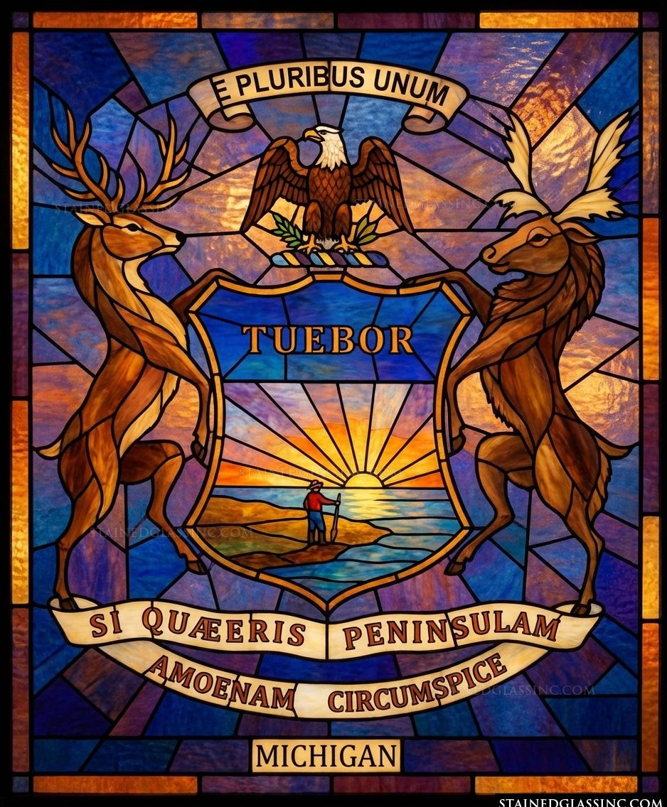 This masterful, stained-glass-style design captures the nobility and natural beauty of the State of Michigan. The composition faithfully renders the official state seal, placing a majestic bald eagle at the summit, flanked by the stoic elk and moose that serve as guardians of the emblem. In the center, a luminous sunrise illuminates a tranquil shoreline, symbolizing the vast promise of the Great Lakes landscape.