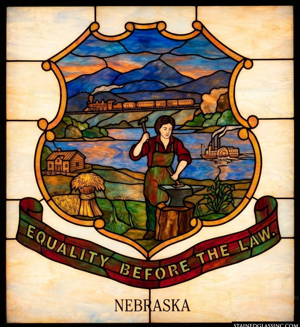 This vibrant design brings the historic Nebraska State Seal to life through a rich, illustrative style. The scene honors the classic imagery of the pioneer spirit, featuring a dedicated blacksmith working at an anvil, surrounded by the emblems of industry and expansion - a steamboat on the river, a train traversing the landscape, and the golden bounty of a harvest.