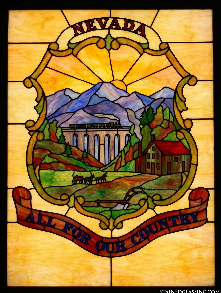 Celebrate the rugged spirit of the American West with this stunning stained-glass-style interpretation of the Nevada state emblem. The design masterfully balances serene natural beauty with the industrial progress of the 19th century, featuring a majestic mountain range backlit by a glowing, golden sun. The composition is framed by an elegant, flowing scroll that proudly displays the state's storied motto, All For Our Country.