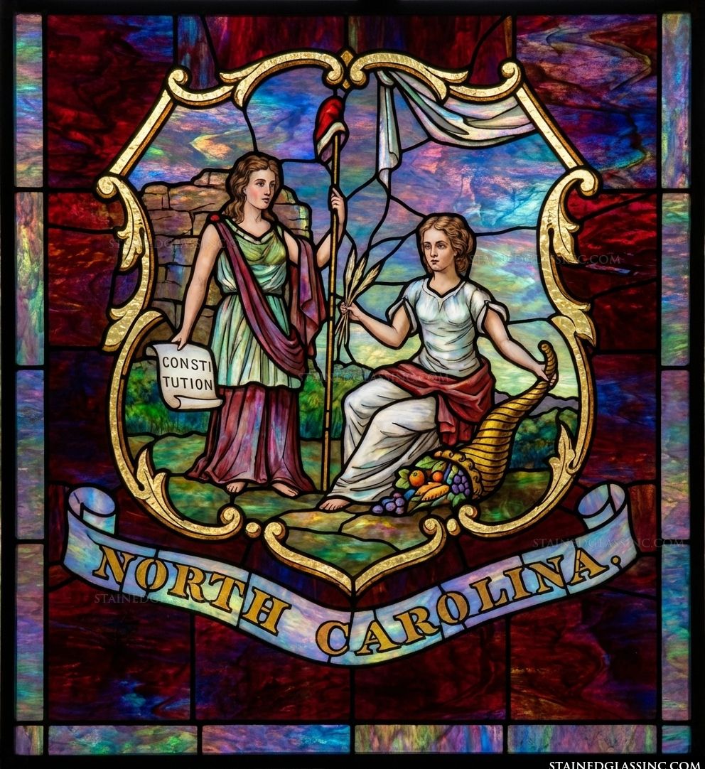 Celebrate the storied heritage of the Tar Heel State with this breathtaking, stained-glass-style interpretation of the North Carolina state seal. The design showcases the elegant allegorical figures of Liberty and Plenty, rendered with masterful detail and depth. Liberty stands proudly, holding a pole capped with a liberty cap, while Plenty rests beside her, gracefully cradling a cornucopia overflowing with the bounty of the land.