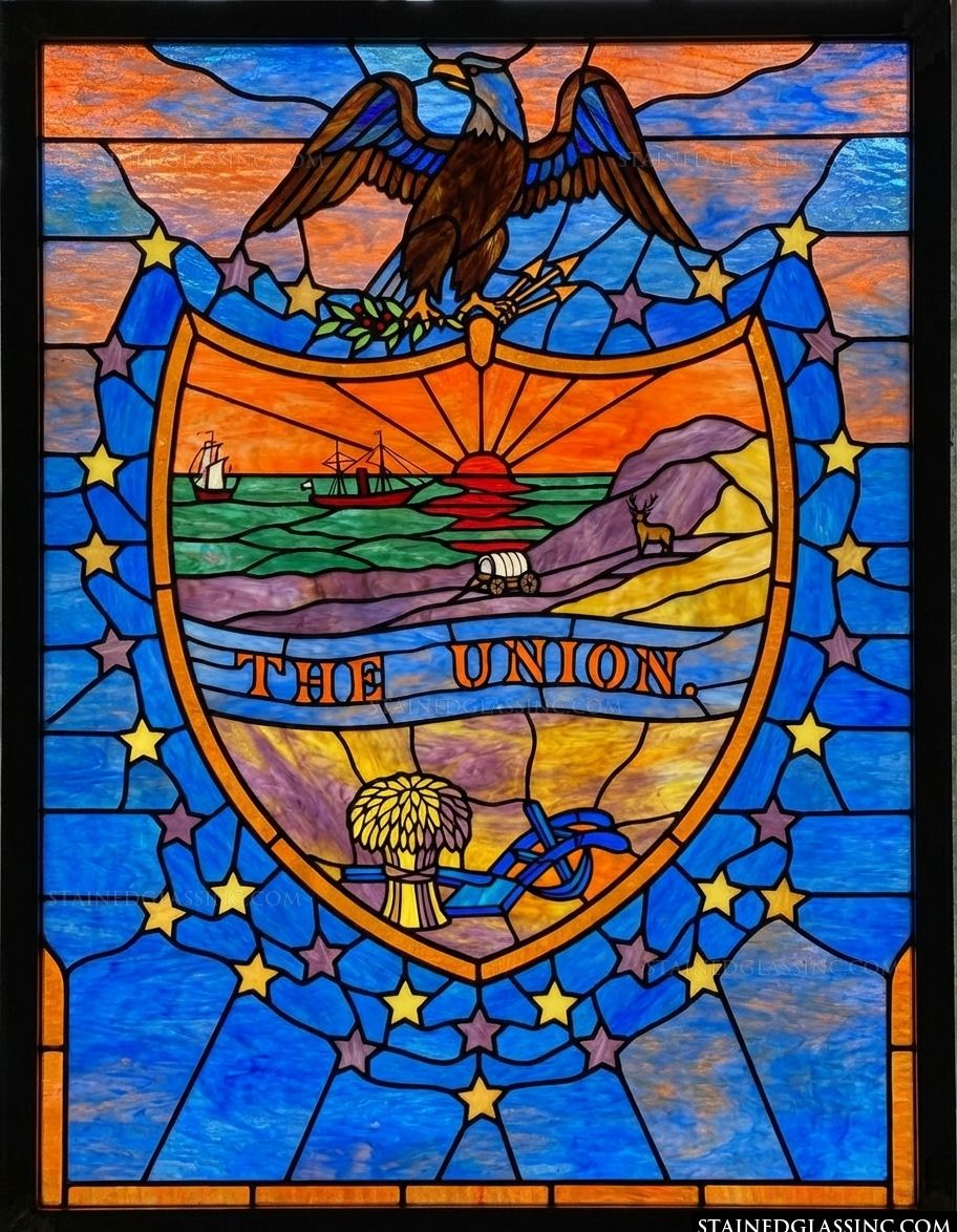 The central shield honors the pioneering journey, featuring a traditional covered wagon and the timeless imagery of the harvest and the plow. Rich, glowing blues and warm sunset hues create a majestic visual, making this a perfect tribute to the enduring strength and unity of the nation.