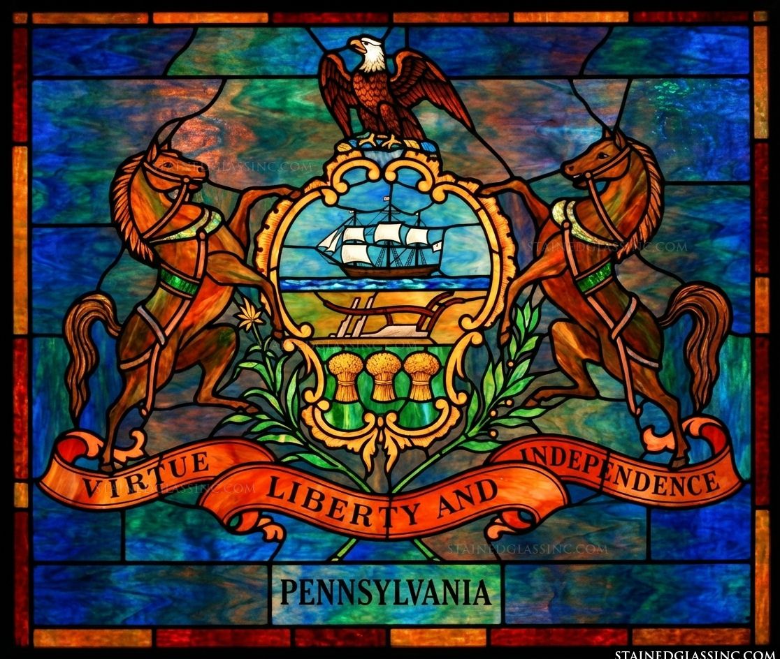 Embrace the spirit of heritage with this luminous design showcasing the official state seal of Pennsylvania. At the center, the artistry captures the strength of the commonwealth, featuring the noble eagle and two spirited horses flanking the central shield. The detailed rendering of the sailing ship, plow, and golden wheat sheaves evokes the industrious roots and natural beauty of the state.