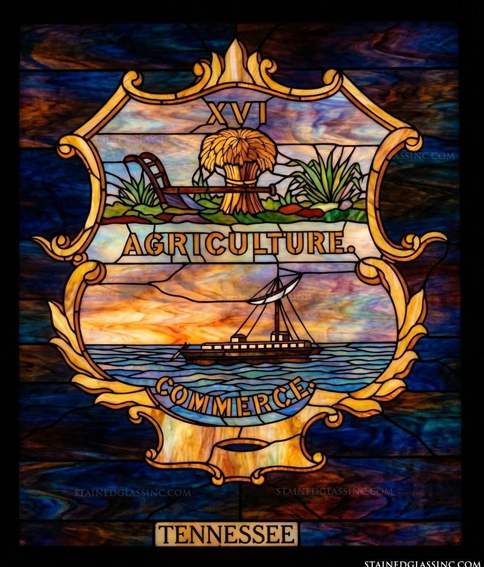 Celebrate regional pride and heritage with this luminous, stained-glass-style tribute to the Great State of Tennessee. This exquisite design masterfully captures the official state seal, rendered in a rich palette that brings the imagery to life with brilliant depth and warmth.