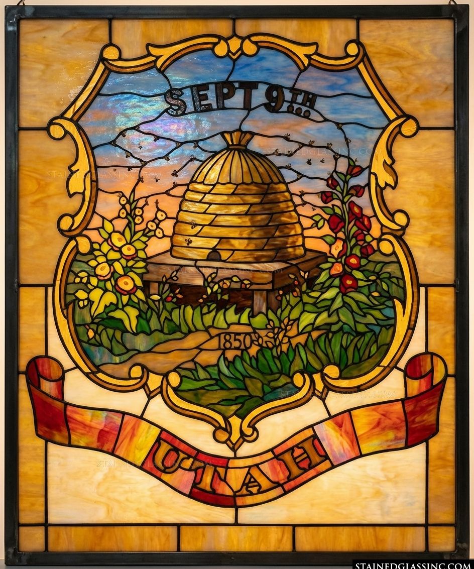 This striking design brings the storied history of Utah to life through a rich, illuminated composition. At the heart of the piece sits a traditional beehive, a powerful symbol of industry and community, nestled within a lush garden setting. The warm, golden hues of the background evoke the soft glow of a sunset, casting a peaceful radiance over the scene.