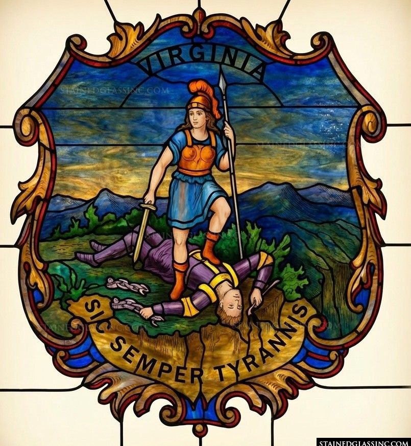 This dignified design beautifully captures the historic emblem of the Commonwealth of Virginia. At its center stands Virtus, the personification of virtue and courage, depicted as an Amazon warrior. She stands triumphantly over the fallen figure of tyranny, symbolizing the victory of liberty and resilience over oppression.