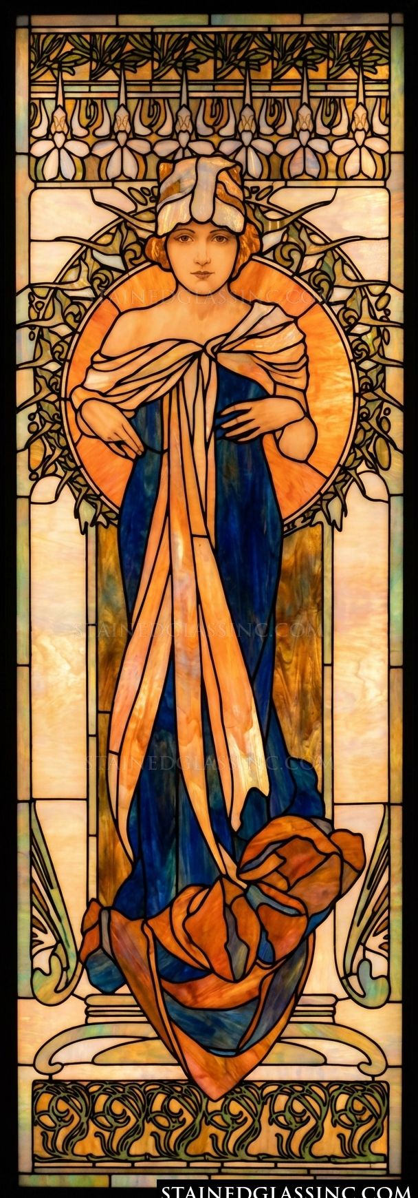 The elegant artwork of Alphonse Mucha is the inspiration for this window. An art nouveau era painter, illustrator, and graphic artist, Mucha lived in Paris during the Art Nouveau period and is known for his beautiful and distinctly stylised and decorative artwork.