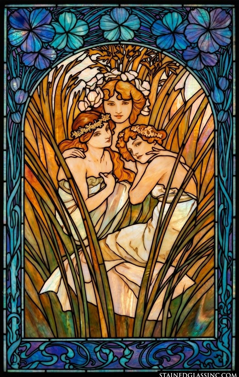 Immerse your space in the serene beauty of this Art Nouveau masterpiece. The design captures three luminous figures, their gentle expressions and flowing white garments echoing a timeless sense of harmony and grace. Nestled within a dense thicket of golden reeds, the figures evoke a quiet, mythical woodland sanctuary, inviting a sense of peace into any room.