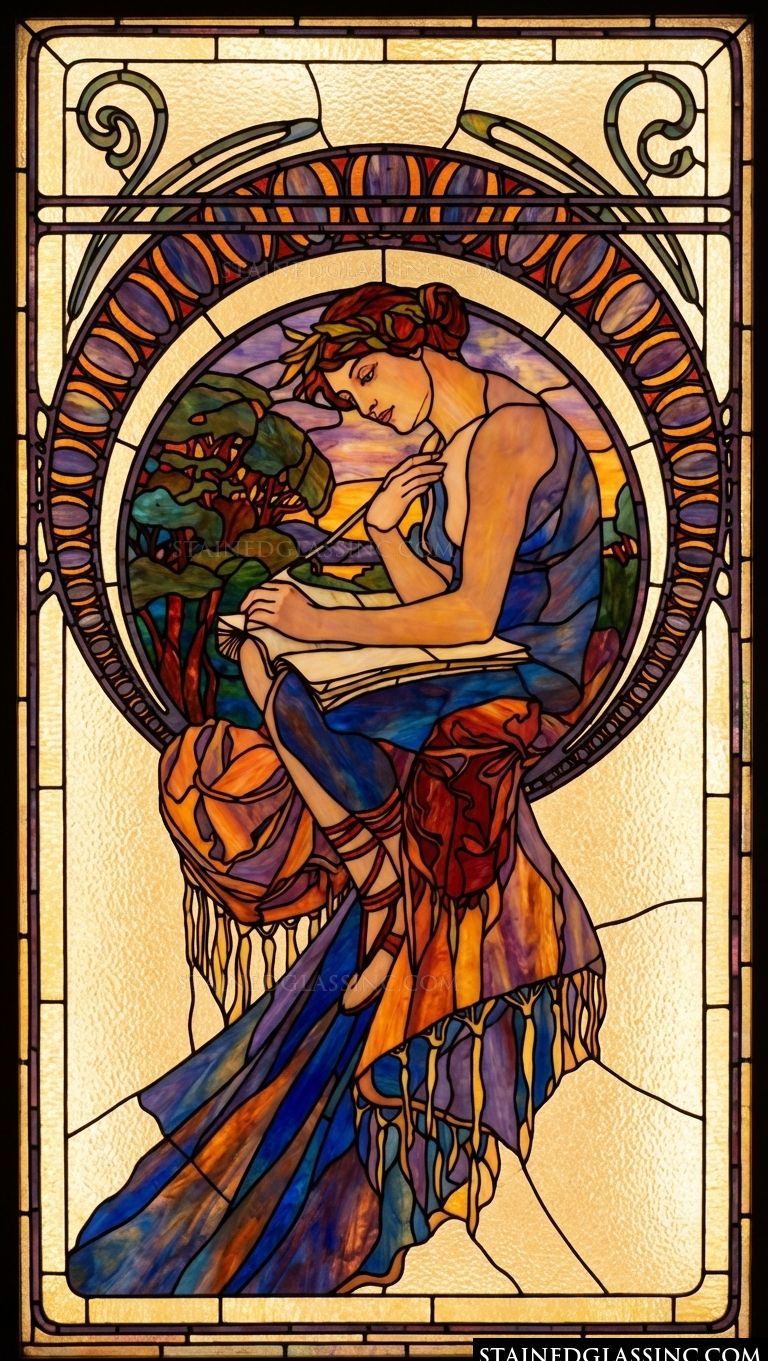 The elegant artwork of Alphonse Mucha is the inspiration for this window. An art nouveau era painter, illustrator, and graphic artist, Mucha lived in Paris during the Art Nouveau period and is known for his beautiful and distinctly stylised and decorative artwork.