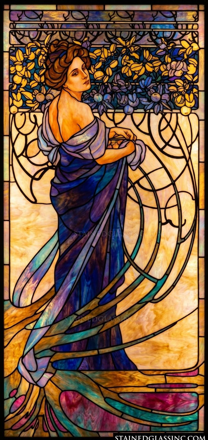 The elegant artwork of Alphonse Mucha is the inspiration for this window. An art nouveau era painter, illustrator, and graphic artist, Mucha lived in Paris during the Art Nouveau period and is known for his beautiful and distinctly stylised and decorative artwork.