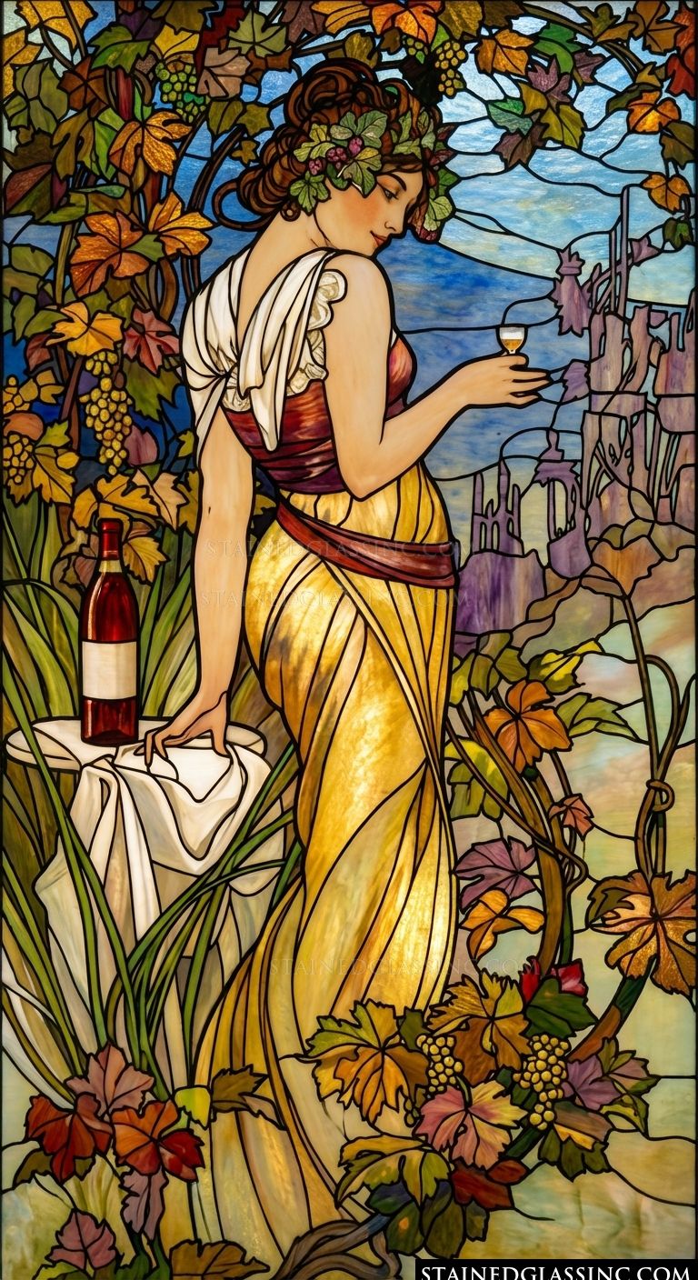 Immerse your space in the golden warmth of the harvest season with this exquisite Art Nouveau style design. The artwork features a graceful maiden, elegantly adorned with a crown of grape leaves, standing in contemplation amidst a vibrant, sun-drenched vineyard. With a gentle focus, she examines a glass of wine, evoking themes of celebration, leisure, and the natural bounty of the earth.