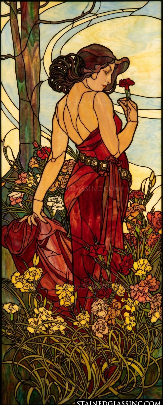 The elegant artwork of Alphonse Mucha is the inspiration for this window. An art nouveau era painter, illustrator, and graphic artist, Mucha lived in Paris during the Art Nouveau period and is known for his beautiful and distinctly stylised and decorative artwork.