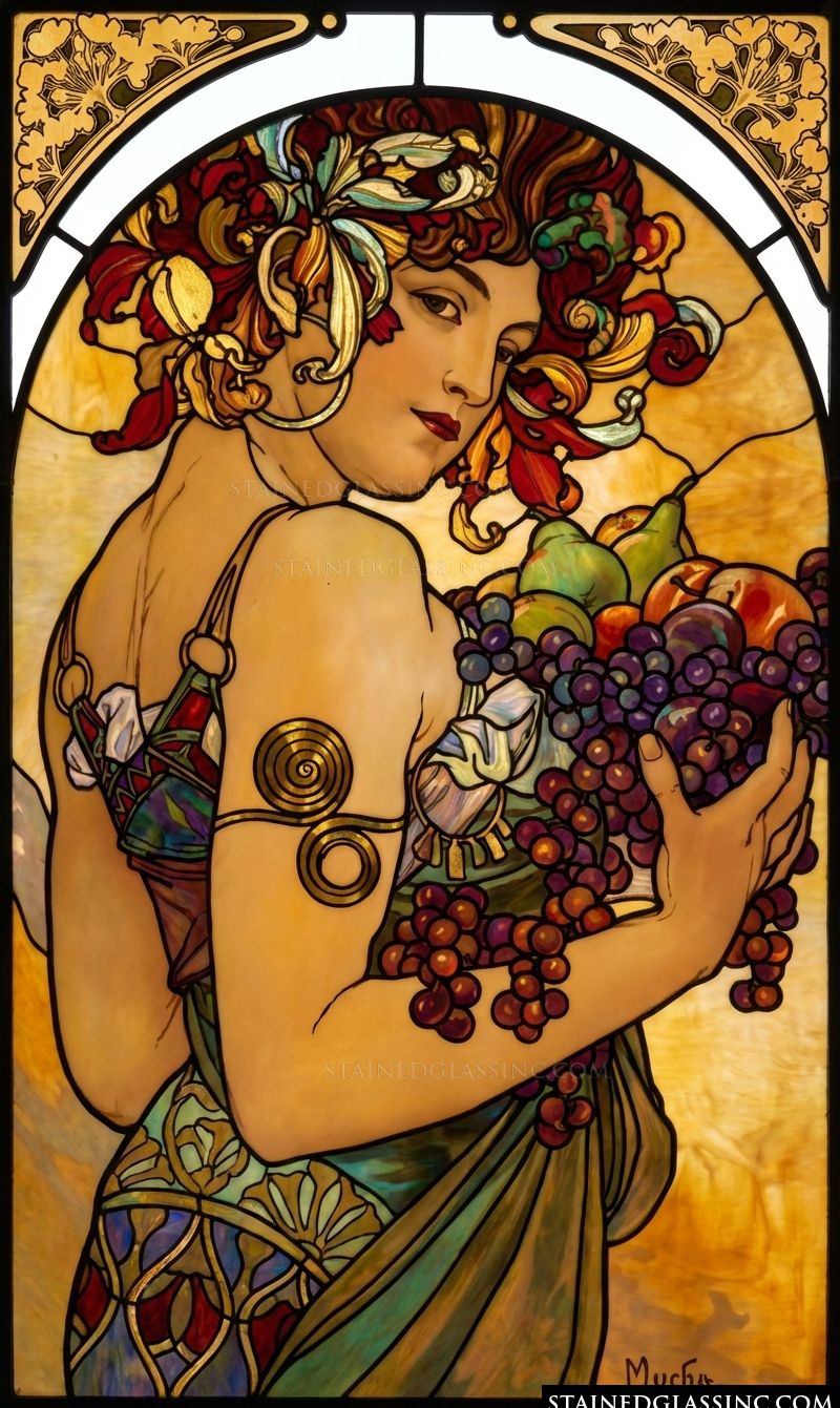 Embrace the timeless elegance of the Art Nouveau movement with this exquisite design inspired by the works of Alphonse Mucha. The composition captures a graceful, ethereal figure gazing back over her shoulder, her hair adorned with intricate floral motifs and flowing ribbons. She cradles a generous abundance of grapes and orchard fruits, a symbol of harvest and vitality rendered in a rich, warm color palette.