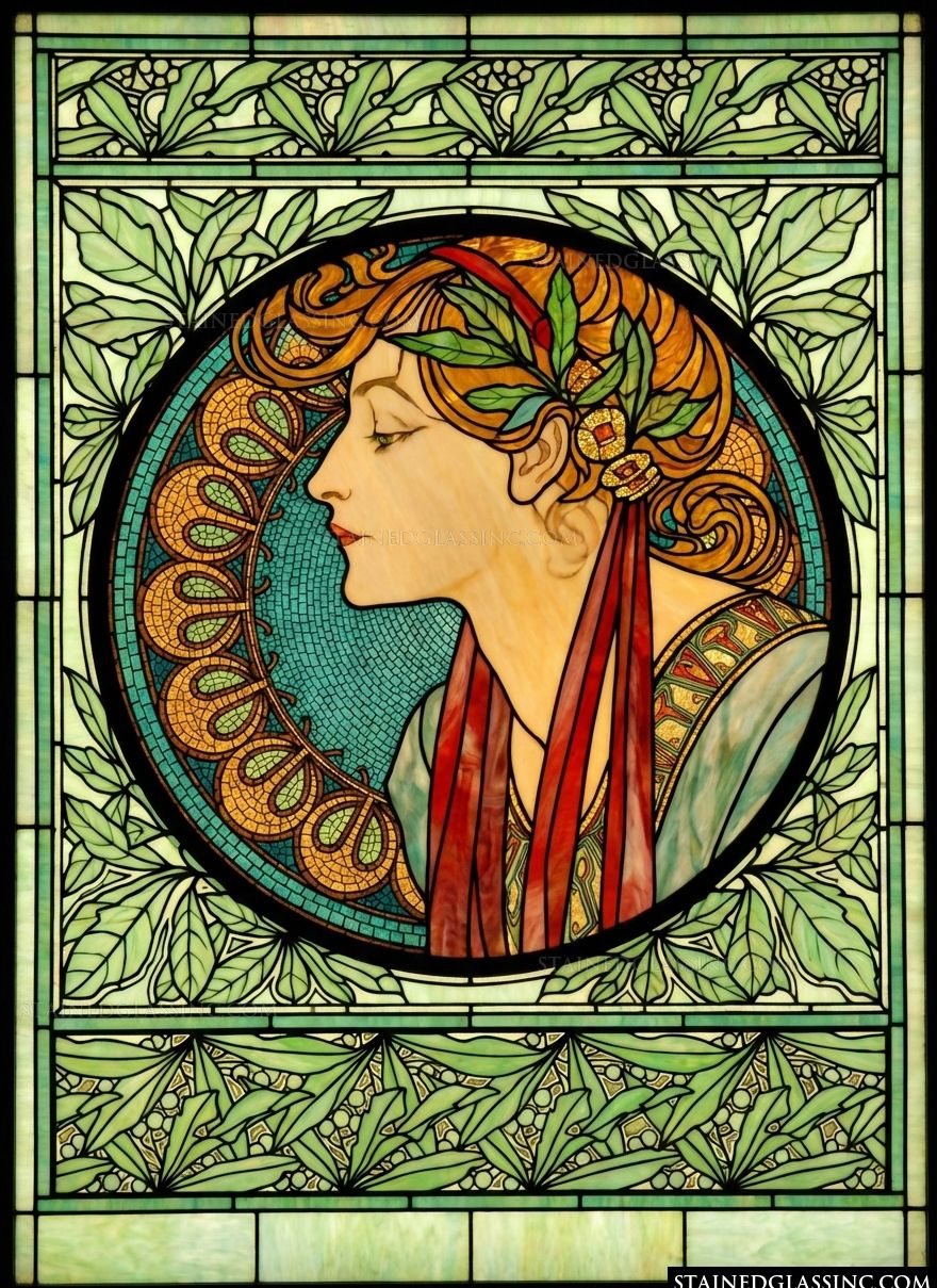 Embrace the timeless elegance of the Art Nouveau movement with this exquisite portrait. The serene profile of a young woman is rendered with delicate precision, her flowing hair adorned with lush green leaves and golden accents. This luminous design captures a sense of quiet grace, making it a sophisticated addition to any home.