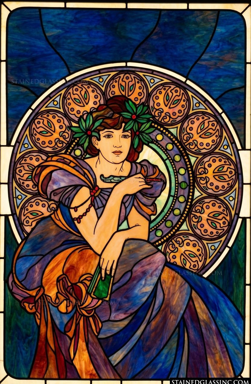 Based on artwork by Alphonse Mucha. Mucha was an art nouveau era painter, illustrator, and graphic artist. Mucha lived in Paris during the Art Nouveau period and is known for his beautiful and distinctly stylised and decorative artwork.