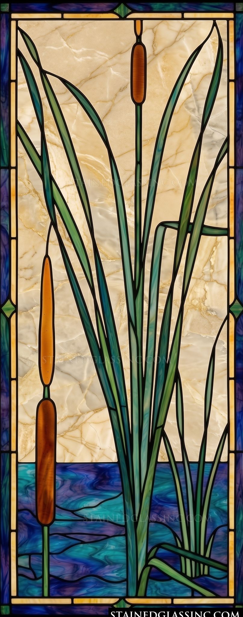 Embrace the tranquil charm of a quiet pond with this stunning stained-glass-style design. The composition artfully captures the graceful silhouette of lush cattails as they rise from a vibrant, swirling expanse of blue water. Each element is rendered with refined detail, highlighting the harmony between the slender greenery and the rich, organic tones of the background.